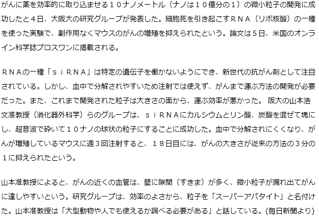 次世代の抗がん剤として注目されている「siRNA」をがんまで運ぶ方法の開発に大阪大学の研究グループが成功。