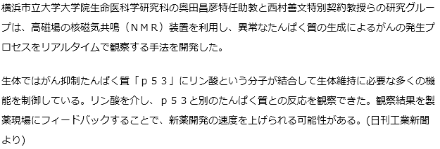 高磁場の核磁気共鳴装置を利用し、がんの発生プロセスをリアルタイムで観察する手法を横浜市大が開発。